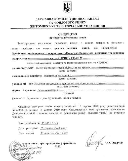 Свідоцтво про державну реєстрацію випуску акцій Товариства
